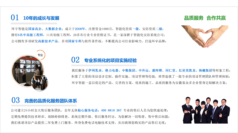合肥市環(huán)宇智能工程有限公司成立于2008年科創(chuàng)版上市企業(yè),現(xiàn)注冊資金1000整,電子與智能化系統(tǒng)集成資質(zhì)壹級,安防資質(zhì),是“國家高新技術(shù)企業(yè)”、“合肥市高新技術(shù)產(chǎn)品認定企業(yè)”、“安徽省安防協(xié)會會員單位”、“AAA級信用等級認證企業(yè)”、“AAA級重合同守信用企業(yè)”、“合肥市創(chuàng)新型企業(yè)”、是行業(yè)領先的智能化整體解決方案的集成商